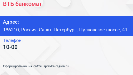ВТБ, банкомат по адресу 196210, Россия, Санкт-Петербург, Пулковское шоссе, 41 в дальнейшем Организация, размещена в следующих категориях: