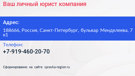 Ваш личный юрист, компания по адресу 188666, Россия, Санкт-Петербург, бульвар Менделеева, 7 к1 в дальнейшем Организация, размещена в следующих категориях: