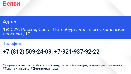 Велви по адресу 192029, Россия, Санкт-Петербург, Большой Смоленский проспект, 10 в дальнейшем Организация, размещена в следующих категориях: