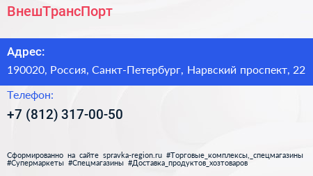 ВнешТрансПорт по адресу 190020, Россия, Санкт-Петербург, Нарвский проспект, 22 в дальнейшем Организация, размещена в следующих категориях:
