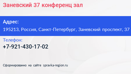 Заневский 37, конференц-зал по адресу 195213, Россия, Санкт-Петербург, Заневский проспект, 37 в дальнейшем Организация, размещена в следующих категориях:
