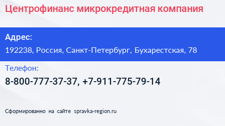 Центрофинанс, микрокредитная компания по адресу 192238, Россия, Санкт-Петербург, Бухарестская, 78 в дальнейшем Организация, размещена в следующих категориях: