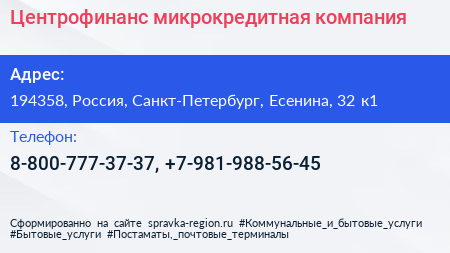 Центрофинанс, микрокредитная компания по адресу 194358, Россия, Санкт-Петербург, Есенина, 32 к1 в дальнейшем Организация, размещена в следующих категориях: