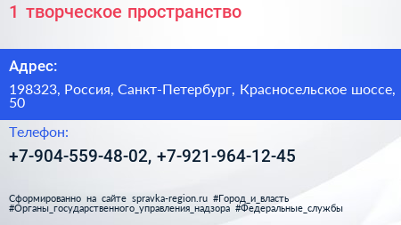 1+, творческое пространство по адресу 198323, Россия, Санкт-Петербург, Красносельское шоссе, 50 в дальнейшем Организация, размещена в следующих категориях: