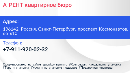 А-РЕНТ, квартирное бюро по адресу 196142, Россия, Санкт-Петербург, проспект Космонавтов, 65 к10 в дальнейшем Организация, размещена в следующих категориях: