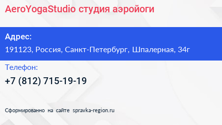 AeroYogaStudio, студия аэройоги по адресу 191123, Россия, Санкт-Петербург, Шпалерная, 34г в дальнейшем Организация, размещена в следующих категориях: