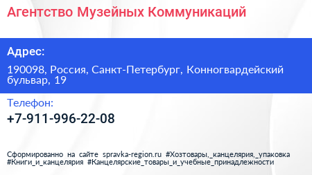 Агентство Музейных Коммуникаций по адресу 190098, Россия, Санкт-Петербург, Конногвардейский бульвар, 19 в дальнейшем Организация, размещена в следующих категориях: