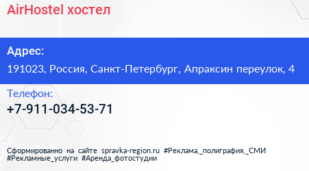 AirHostel, хостел по адресу 191023, Россия, Санкт-Петербург, Апраксин переулок, 4 в дальнейшем Организация, размещена в следующих категориях:
