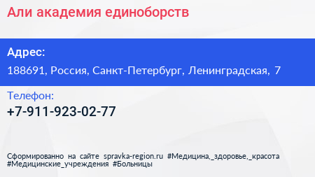 Али, академия единоборств по адресу 188691, Россия, Санкт-Петербург, Ленинградская, 7 в дальнейшем Организация, размещена в следующих категориях: