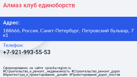 Алмаз, клуб единоборств по адресу 188666, Россия, Санкт-Петербург, Петровский бульвар, 7 к1 в дальнейшем Организация, размещена в следующих категориях: