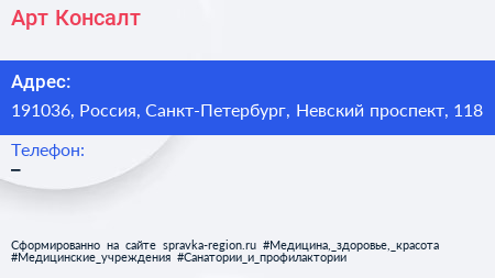 Арт-Консалт по адресу 191036, Россия, Санкт-Петербург, Невский проспект, 118 в дальнейшем Организация, размещена в следующих категориях: