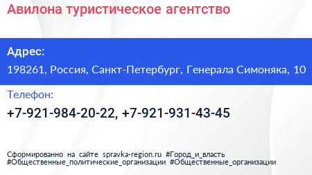 Авилона, туристическое агентство по адресу 198261, Россия, Санкт-Петербург, Генерала Симоняка, 10 в дальнейшем Организация, размещена в следующих категориях:
