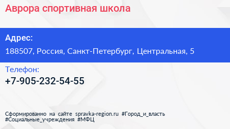 Аврора, спортивная школа по адресу 188507, Россия, Санкт-Петербург, Центральная, 5 в дальнейшем Организация, размещена в следующих категориях: