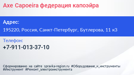 Axe Capoeira, федерация капоэйра по адресу 195220, Россия, Санкт-Петербург, Бутлерова, 11 к3 в дальнейшем Организация, размещена в следующих категориях: