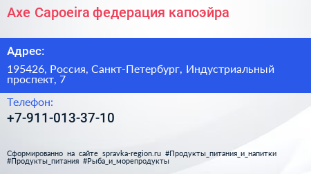 Axe Capoeira, федерация капоэйра по адресу 195426, Россия, Санкт-Петербург, Индустриальный проспект, 7 в дальнейшем Организация, размещена в следующих категориях: