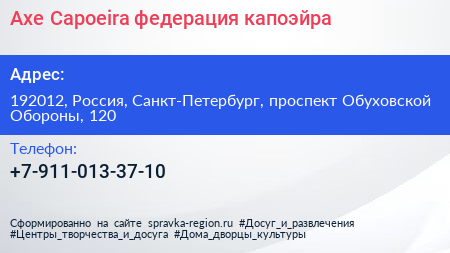 Axe Capoeira, федерация капоэйра по адресу 192012, Россия, Санкт-Петербург, проспект Обуховской Обороны, 120 в дальнейшем Организация, размещена в следующих категориях: