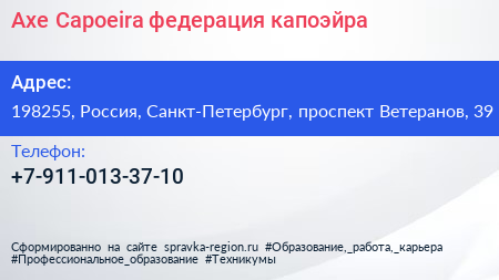 Axe Capoeira, федерация капоэйра по адресу 198255, Россия, Санкт-Петербург, проспект Ветеранов, 39 в дальнейшем Организация, размещена в следующих категориях:
