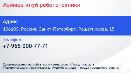 Азимов, клуб робототехники по адресу 196105, Россия, Санкт-Петербург, Решетникова, 15 в дальнейшем Организация, размещена в следующих категориях: