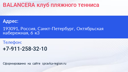 BALANCERA, клуб пляжного тенниса по адресу 193091, Россия, Санкт-Петербург, Октябрьская набережная, 6 к3 в дальнейшем Организация, размещена в следующих категориях: