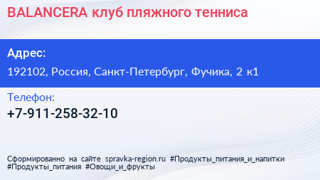 BALANCERA, клуб пляжного тенниса по адресу 192102, Россия, Санкт-Петербург, Фучика, 2 к1 в дальнейшем Организация, размещена в следующих категориях: