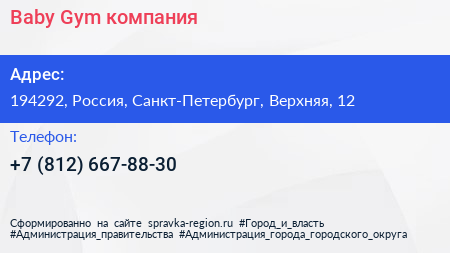 Baby-Gym, компания по адресу 194292, Россия, Санкт-Петербург, Верхняя, 12 в дальнейшем Организация, размещена в следующих категориях: