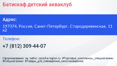 Батискаф, детский акваклуб по адресу 197374, Россия, Санкт-Петербург, Стародеревенская, 11 к2 в дальнейшем Организация, размещена в следующих категориях:
