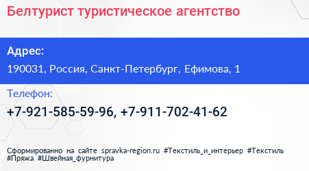 Белтурист, туристическое агентство по адресу 190031, Россия, Санкт-Петербург, Ефимова, 1 в дальнейшем Организация, размещена в следующих категориях: