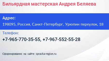 Бильярдная мастерская Андрея Беляева по адресу 198095, Россия, Санкт-Петербург, Урюпин переулок, 18 в дальнейшем Организация, размещена в следующих категориях: