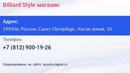 Billiard Style, магазин по адресу 199106, Россия, Санкт-Петербург, Косая линия, 10 в дальнейшем Организация, размещена в следующих категориях: