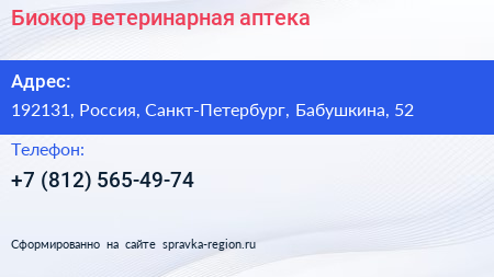 Биокор, ветеринарная аптека по адресу 192131, Россия, Санкт-Петербург, Бабушкина, 52 в дальнейшем Организация, размещена в следующих категориях: