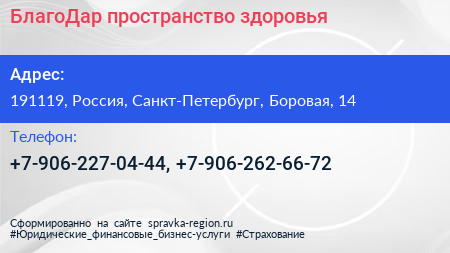 БлагоДар, пространство здоровья по адресу 191119, Россия, Санкт-Петербург, Боровая, 14 в дальнейшем Организация, размещена в следующих категориях: