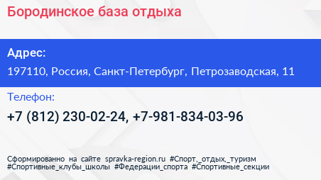 Бородинское, база отдыха по адресу 197110, Россия, Санкт-Петербург, Петрозаводская, 11 в дальнейшем Организация, размещена в следующих категориях: