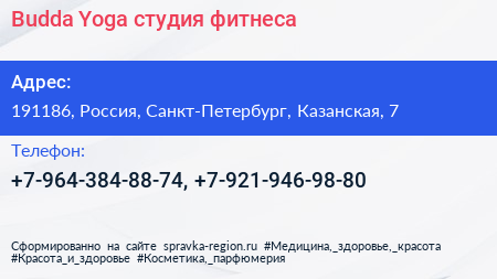Budda Yoga, студия фитнеса по адресу 191186, Россия, Санкт-Петербург, Казанская, 7 в дальнейшем Организация, размещена в следующих категориях: