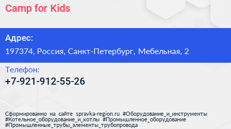 Camp for Kids по адресу 197374, Россия, Санкт-Петербург, Мебельная, 2 в дальнейшем Организация, размещена в следующих категориях:
