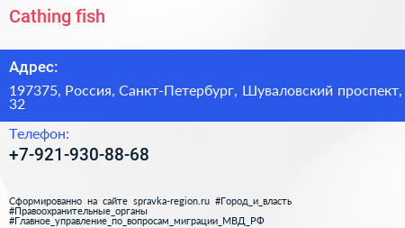 Cathing-fish по адресу 197375, Россия, Санкт-Петербург, Шуваловский проспект, 32 в дальнейшем Организация, размещена в следующих категориях: