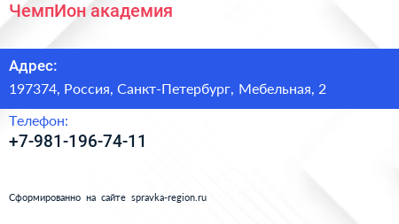 ЧемпИон, академия по адресу 197374, Россия, Санкт-Петербург, Мебельная, 2 в дальнейшем Организация, размещена в следующих категориях: