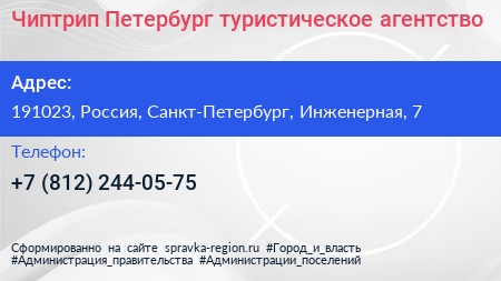 Чиптрип Петербург, туристическое агентство по адресу 191023, Россия, Санкт-Петербург, Инженерная, 7 в дальнейшем Организация, размещена в следующих категориях: