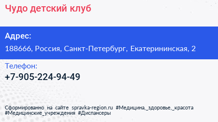 Чудо, детский клуб по адресу 188666, Россия, Санкт-Петербург, Екатерининская, 2 в дальнейшем Организация, размещена в следующих категориях: