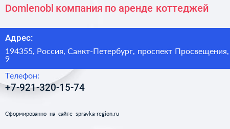 Domlenobl, компания по аренде коттеджей по адресу 194355, Россия, Санкт-Петербург, проспект Просвещения, 9 в дальнейшем Организация, размещена в следующих категориях: