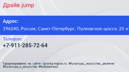 Драйв jump по адресу 196240, Россия, Санкт-Петербург, Пулковское шоссе, 25 к1 в дальнейшем Организация, размещена в следующих категориях: