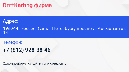 DriftKarting, фирма по адресу 196244, Россия, Санкт-Петербург, проспект Космонавтов, 14 в дальнейшем Организация, размещена в следующих категориях:
