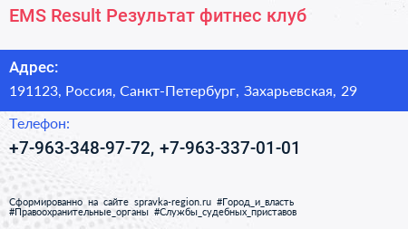 ЕМS Result Результат, фитнес-клуб по адресу 191123, Россия, Санкт-Петербург, Захарьевская, 29 в дальнейшем Организация, размещена в следующих категориях: