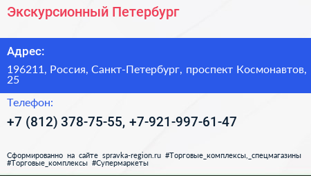Экскурсионный Петербург по адресу 196211, Россия, Санкт-Петербург, проспект Космонавтов, 25 в дальнейшем Организация, размещена в следующих категориях: