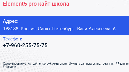 Element5.pro, кайт-школа по адресу 198188, Россия, Санкт-Петербург, Васи Алексеева, 6 в дальнейшем Организация, размещена в следующих категориях: