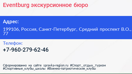 Eventburg, экскурсионное бюро по адресу 199106, Россия, Санкт-Петербург, Средний проспект В.О., 77 в дальнейшем Организация, размещена в следующих категориях: