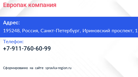 Европак, компания по адресу 195248, Россия, Санкт-Петербург, Ириновский проспект, 1 в дальнейшем Организация, размещена в следующих категориях: