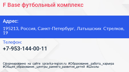 F-Base, футбольный комплекс по адресу 195213, Россия, Санкт-Петербург, Латышских Стрелков, 19 в дальнейшем Организация, размещена в следующих категориях: