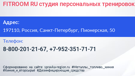 FITROOM.RU, студия персональных тренировок по адресу 197110, Россия, Санкт-Петербург, Пионерская, 50 в дальнейшем Организация, размещена в следующих категориях: