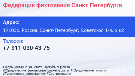 Федерация фехтования Санкт-Петербурга по адресу 191036, Россия, Санкт-Петербург, Советская 1-я, 6 к2 в дальнейшем Организация, размещена в следующих категориях: