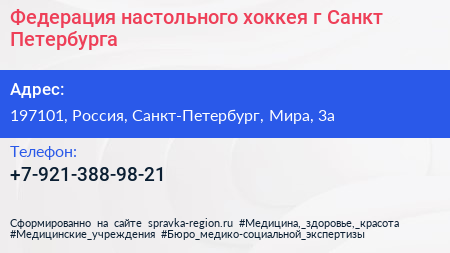 Федерация настольного хоккея г. Санкт-Петербурга по адресу 197101, Россия, Санкт-Петербург, Мира, 3а в дальнейшем Организация, размещена в следующих категориях: